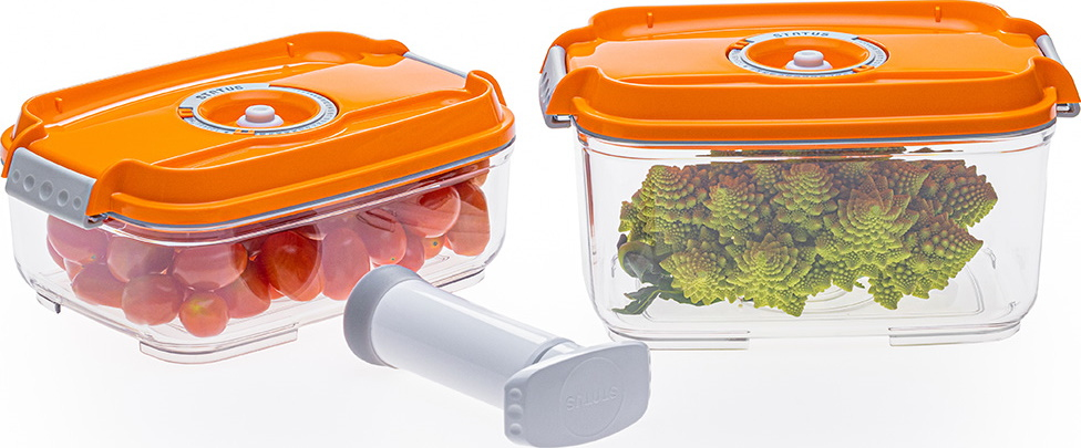 Вакуумные контейнеры STATUS VAC-REC-DUET используются для хранения жидких и твёрдых продуктов на предприятиях общественного питания и торговли, а также в домашних условиях. Вакуумная упаковка значительно увеличивает срок хранения продуктов питания. Изготовлены из тритана, крышки - из пластика.